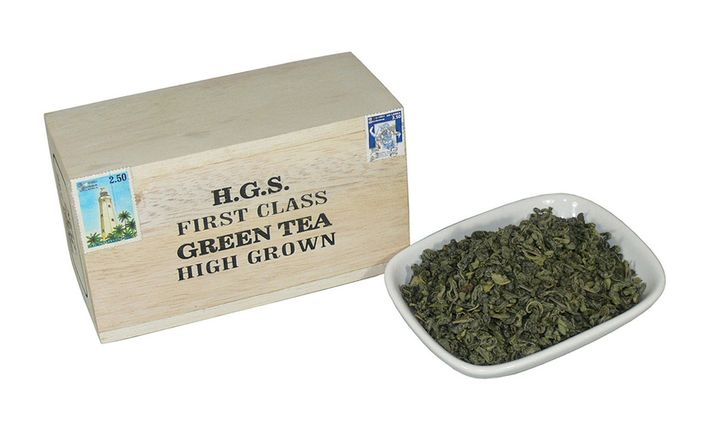 Der lose Tee ist in einem dekorativen Holzkästchen verpackt, die mit je zwei original Briefmarken verziert sind.